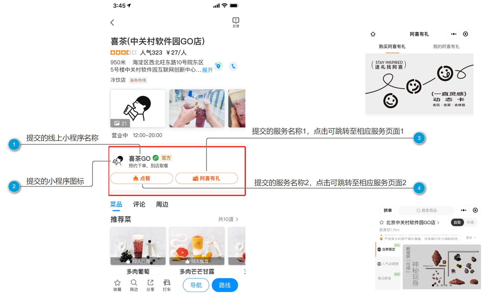 【服务路径】服务对应的跳转页面。注意:必须是该门店的小程序服务页面路径。例如,该商户为喜茶(朝阳大悦城店),则进入的小程序服务页也必须定位在喜茶(朝阳大悦城店),不能是其他分店服务路径