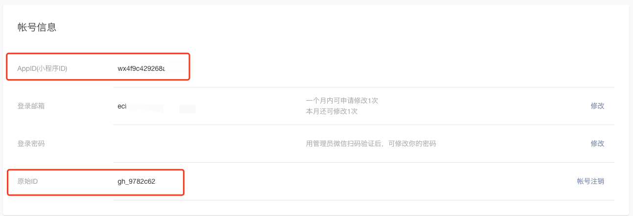 获取方法一:可登陆小程序管理平台进行查看,进入微信管理页选择左侧状态栏的设置—基础设置—账号信息