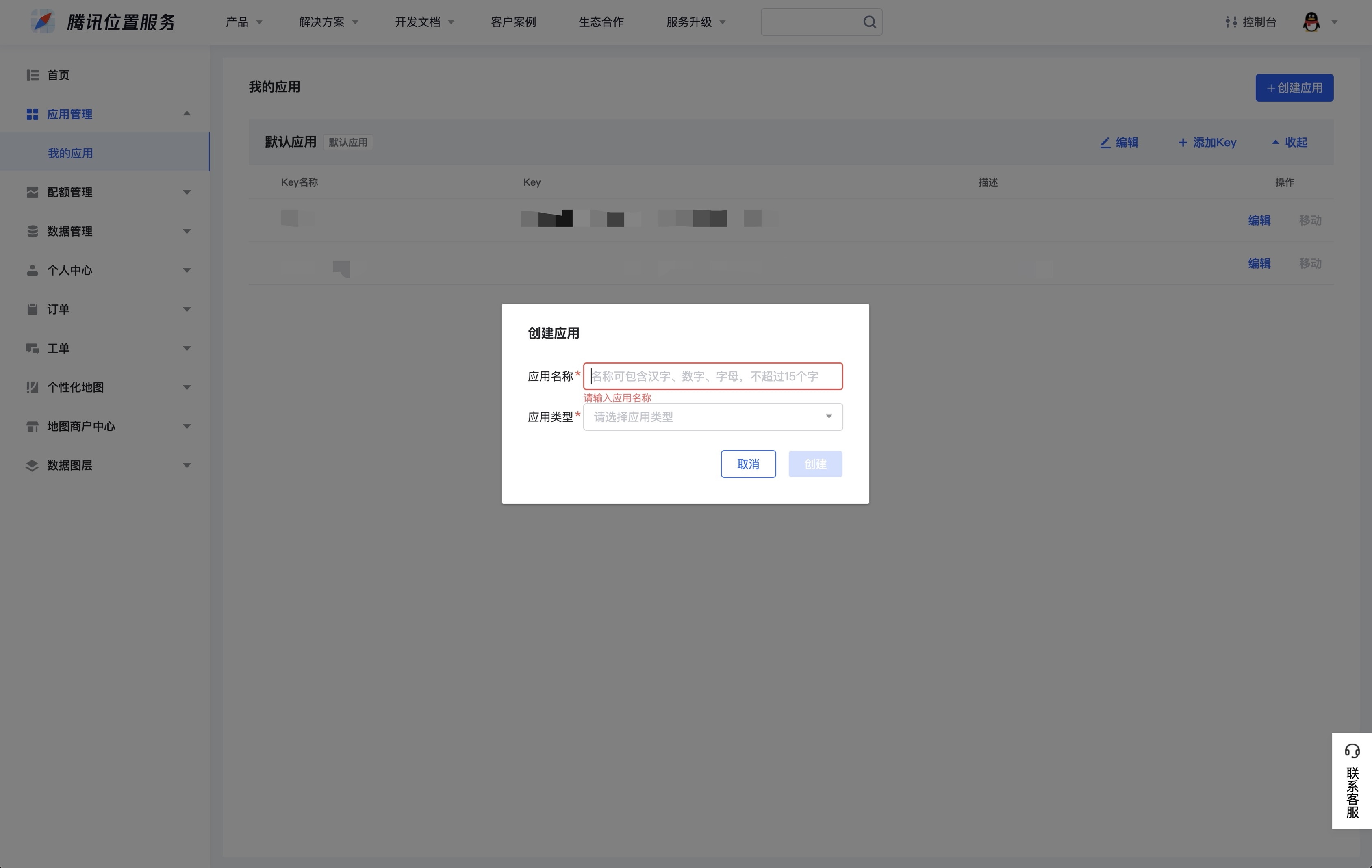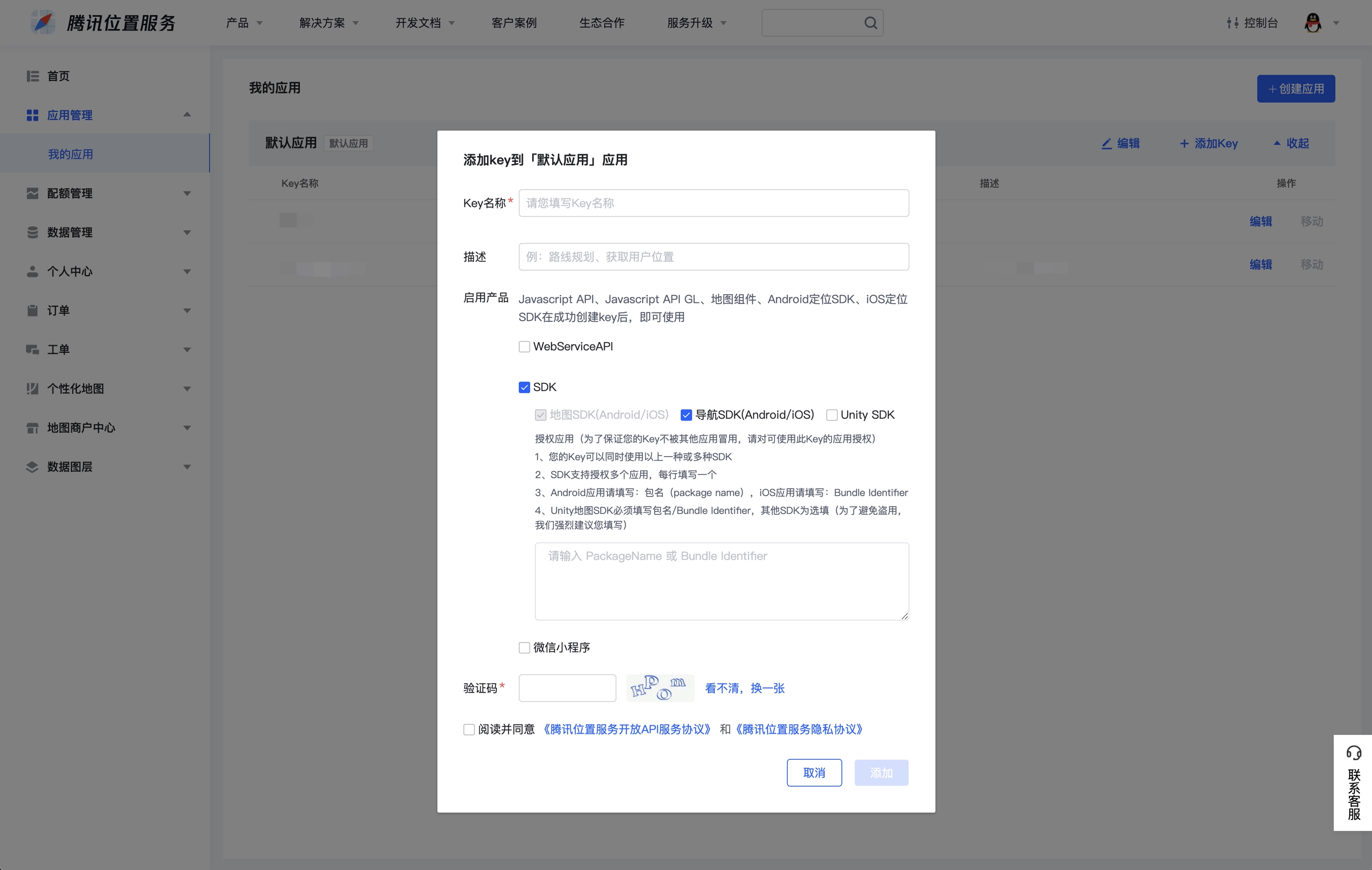 填写KEY名称、描述、阅读并同意使用条款等应用信息;