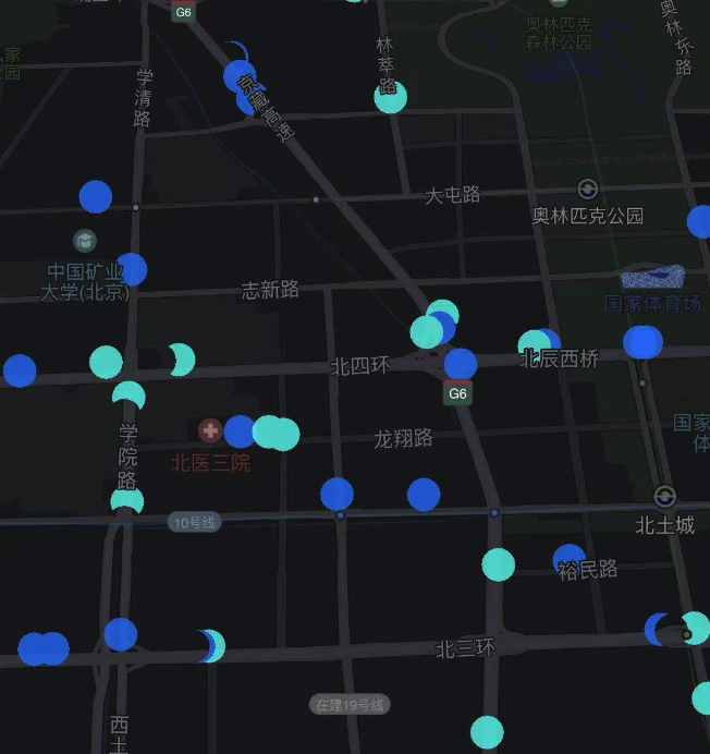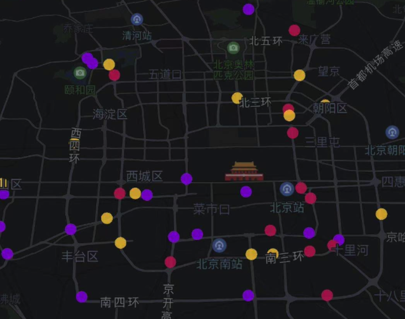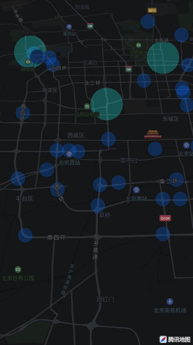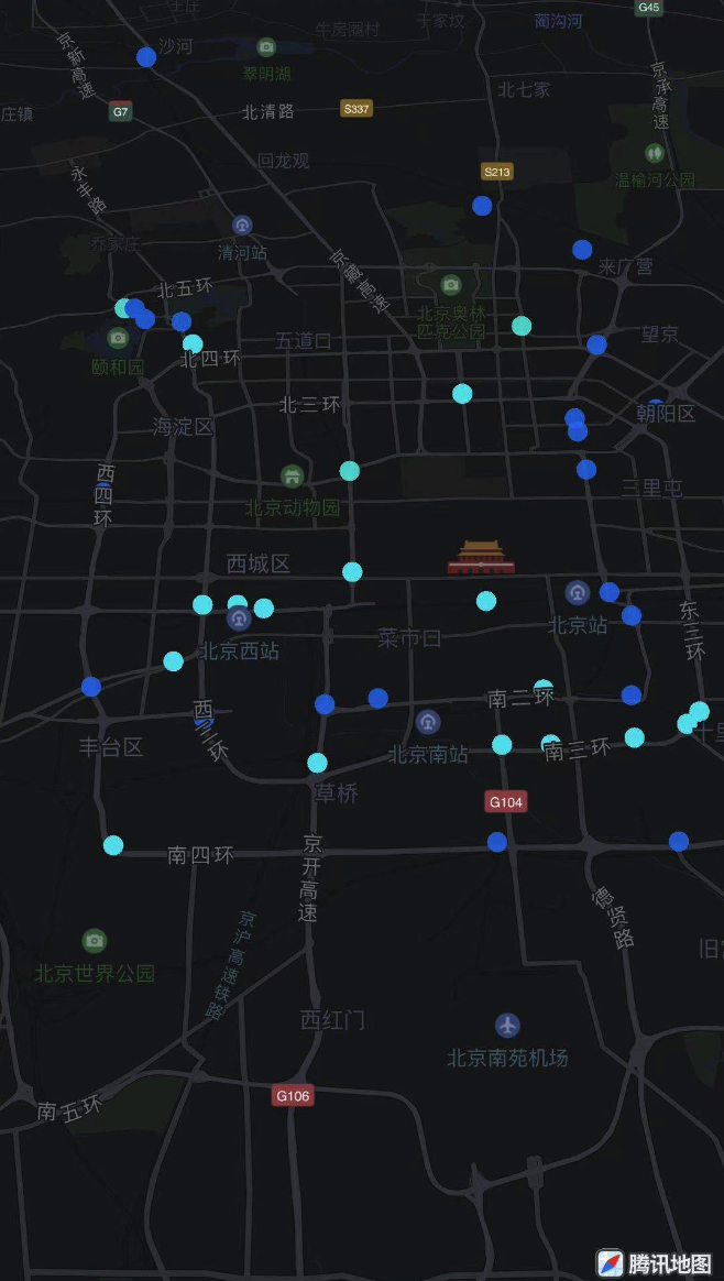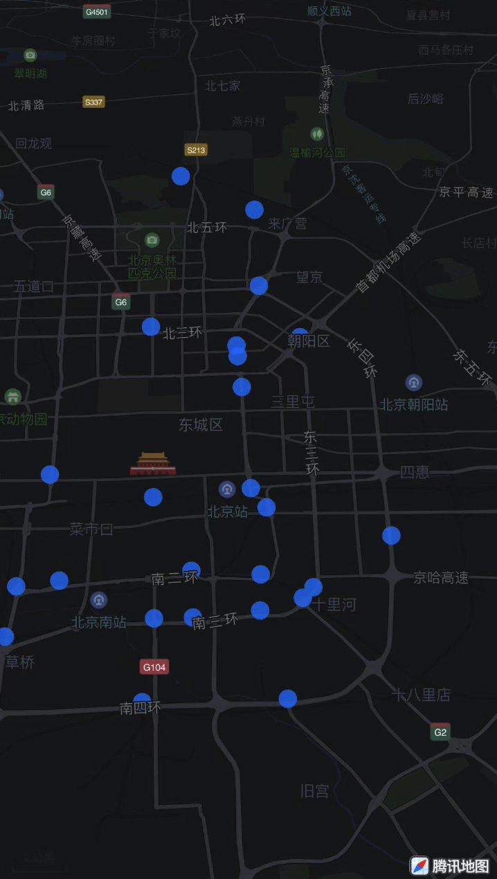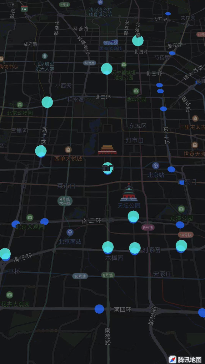腾讯地图SDK自4.4.7版本起支持散点图功能,该功能可以根据大量的点坐标在地图上展示散点效果,示例图如下: