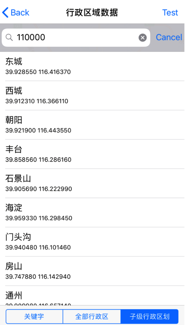 | NSString *keyword | 搜索关键词: 支持输入一个文本关键词:keyword=北京 支持多个行政区划代码,英文逗号分隔:keyword=130681,419001 |