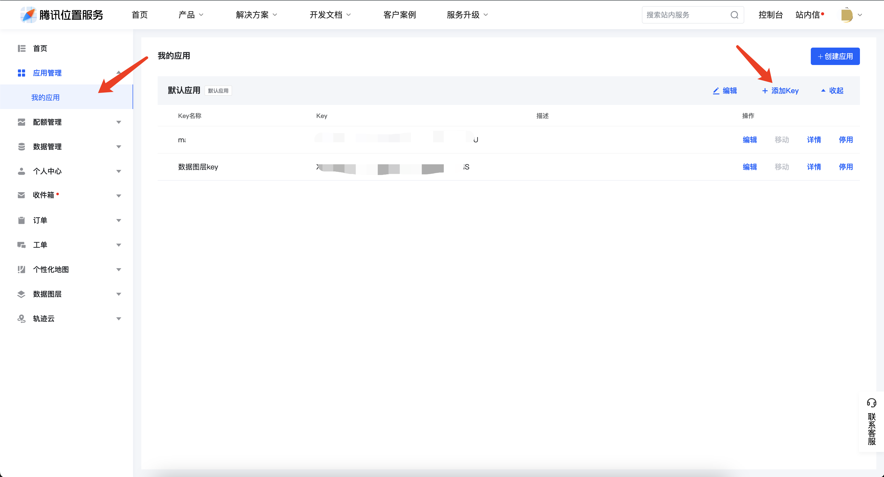 出行SDK使用前需要先配置APIKey进行鉴权,因为出行SDK中会引用地图SDK和WebServiceAPI,因此可以同时配置地图SDK和webServiceAPI为统一的Key,可前往 https://lbs.qq.com/dev/console/application/mine 点击“添加Key”进行配置。