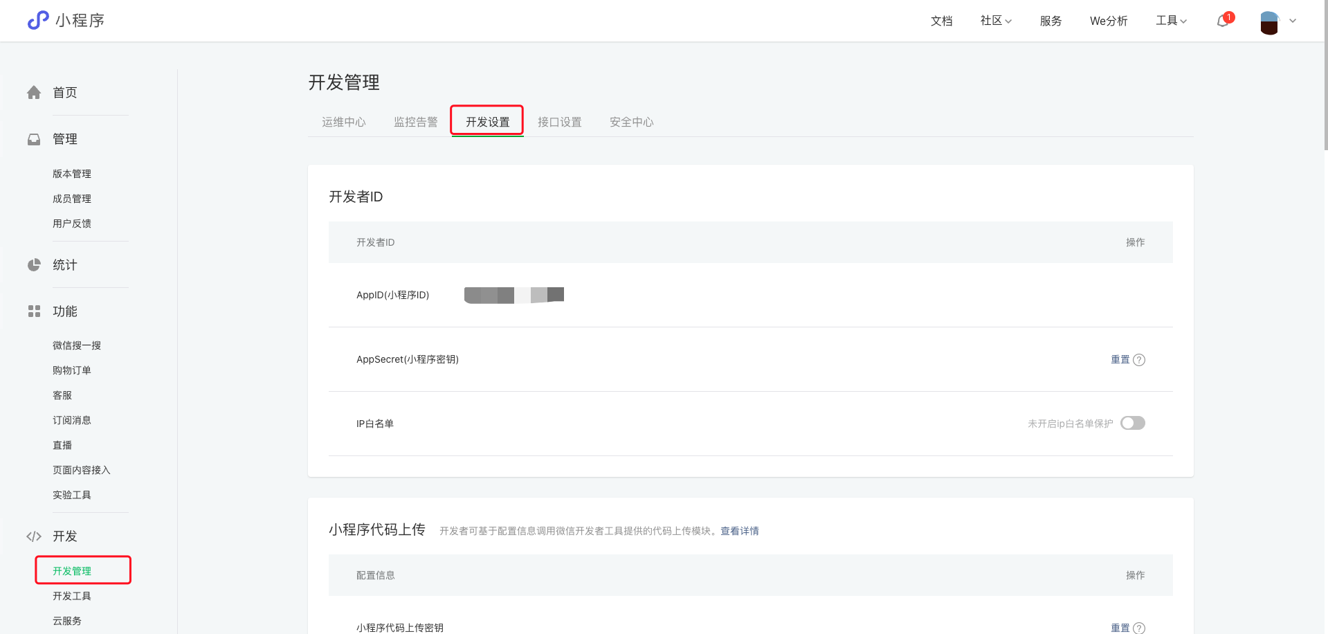 进入微信小程序首页。在【开发管理】界面,选择【开发设置】