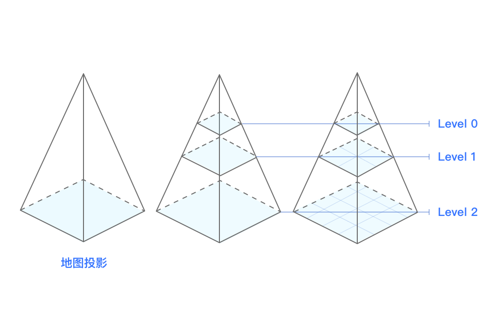 随着放大到级别为N时,会将地图切割成4^N个区域,这些区域都是等大的正方形(一般为256px)。
