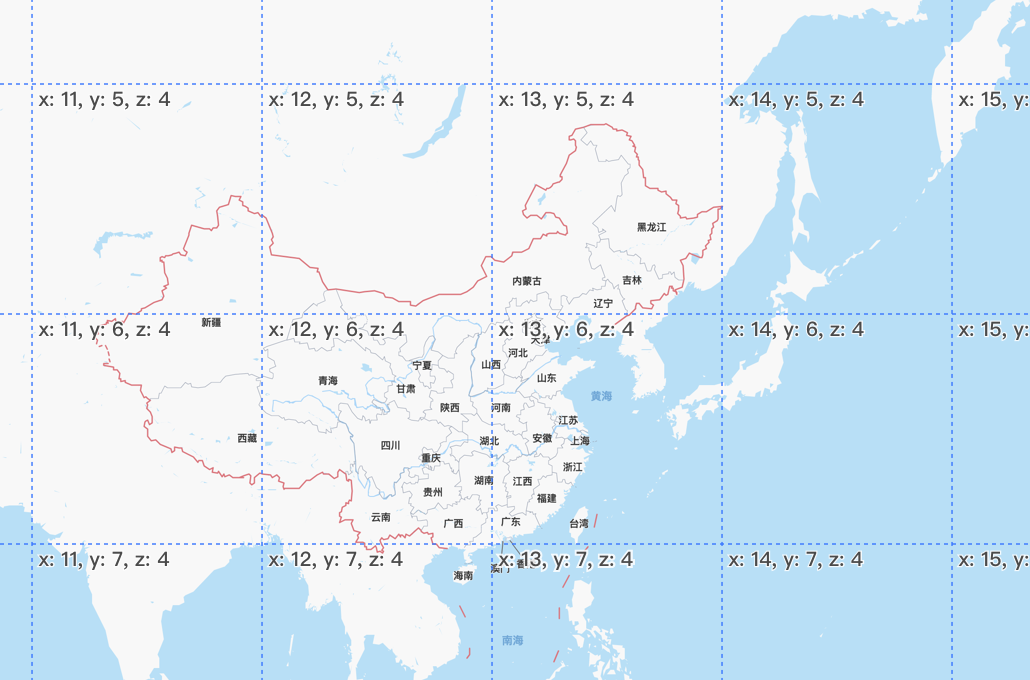 每个瓦片具有特定的编号,一般以(x, y, z)进行表示,腾讯地图JavaScript API中以左上角为原点,x表示列号,y表示行号,z表示缩放等级。