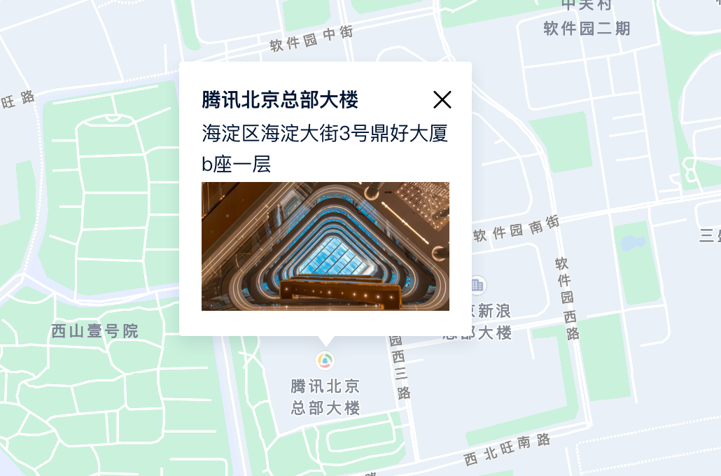 信息窗口常被用在点标记(marker)被点击后,弹开信息窗口展示摘要信息,若多个marker被点击,也仅显示最后一个被点击的marker的信息窗口,示例如下: