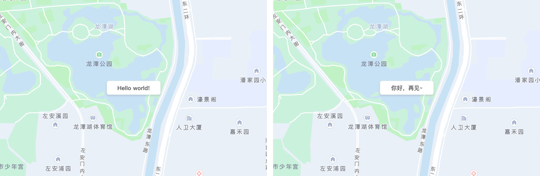 为了您能够快速上手,以下代码为您演示了一个最简单的DOMOverlay的定义与使用的方法,供您参考: (代码执行后显示地图,并创建自定义infoWindow,初始文字“Hello world!”,两秒钟后变为:“你好再见~” )
