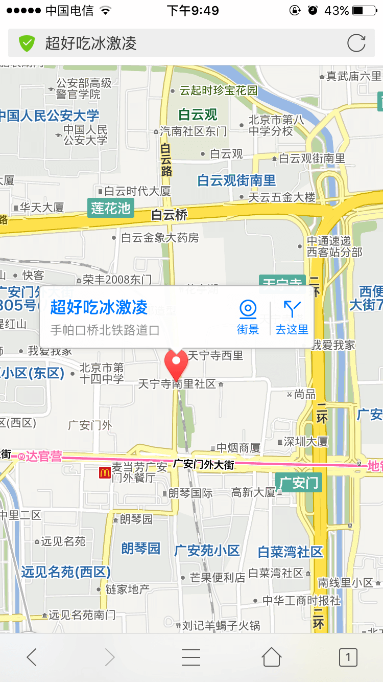 | marker | 是 | marker参数的格式:marker=markerAttributesImarkerAttributesI…每个markerAttributes定义了一个标注的全部属性,markerAttributes之间以"I"分隔。markerAttributes格式:key:value;key:value…key是属性名,key取值包括coord、title、addr、tel、uid等属性名,参见marker属性表。value是属性值,如coord的value形式为"lat,lng"。各属性的取值说明请参考:marker属性表。各key和value之间用英文冒号分隔,各key/value对之间用英文分号分隔。注:目前PC端仅支持添加一个标注,也即只能有一个属性集。移动端支持多个点的标注,参考 位置展示组件 | marker=coord:39.892326,116.342763;title:超好吃冰激凌;addr:手帕口桥北铁路道口 |