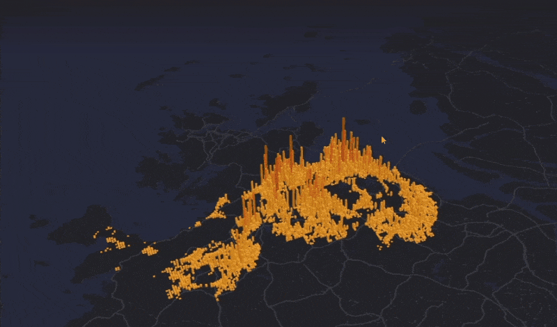 网格热力图将离散的数据点以正方形区域进行聚合,根据落入区域内的数据点数量渲染不同颜色的高度的正方形棱柱。